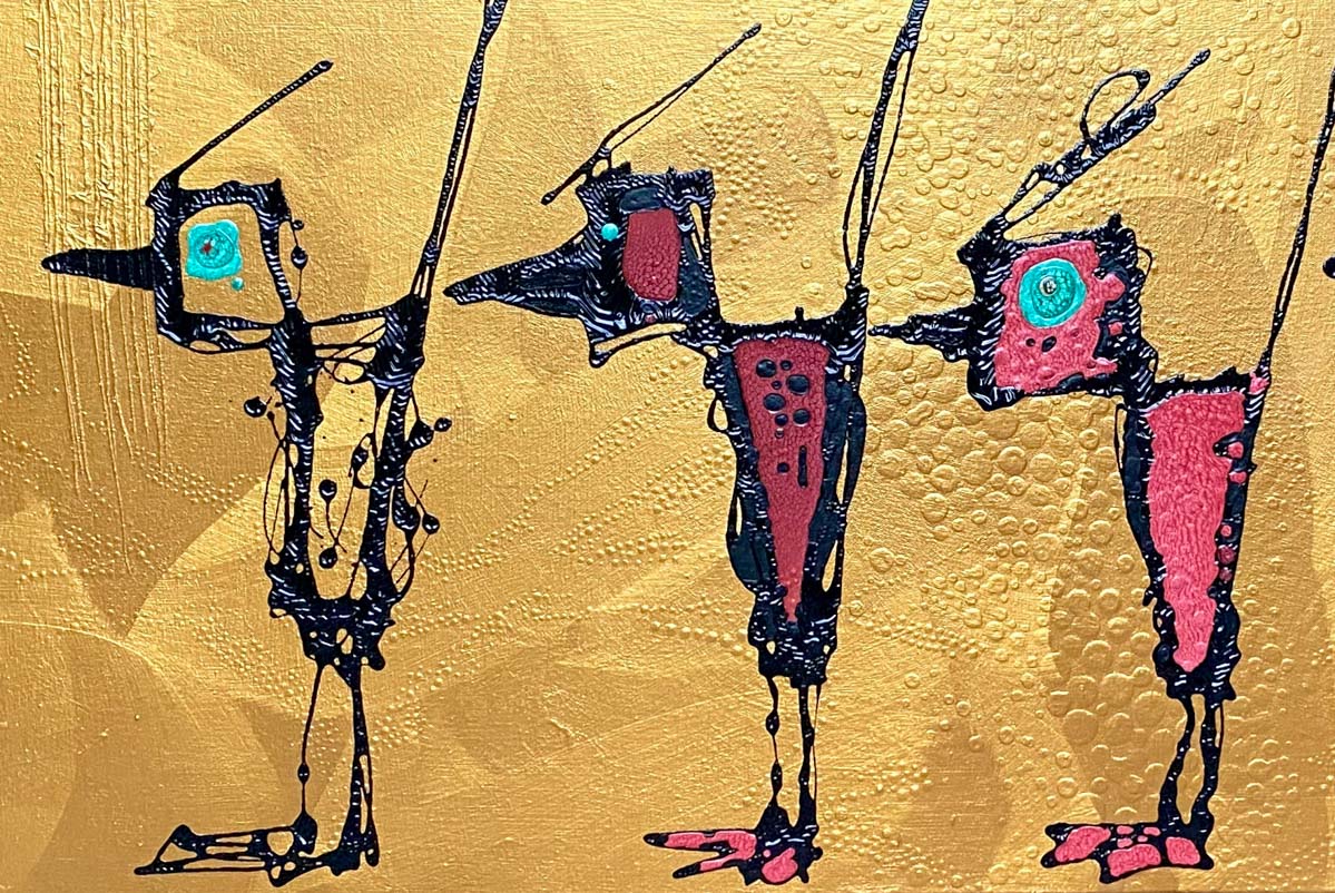 These colorful birds line up before a gold background. Reminiscent of Ferdinand Hodler’s parallelism, this painting leaves open many questions for the viewer. Are the birds walking in a procession? Lined up on a branch? These brothers hold secrets, but they hold them in common.